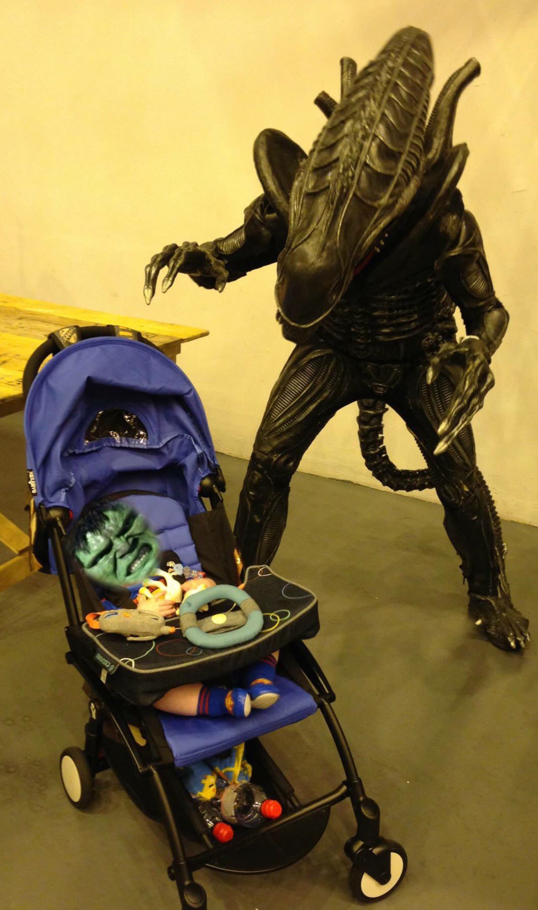 Scifi baby meeting an Alien. You can’t tell because of the Hulk head but I promise he is actually smiling!
